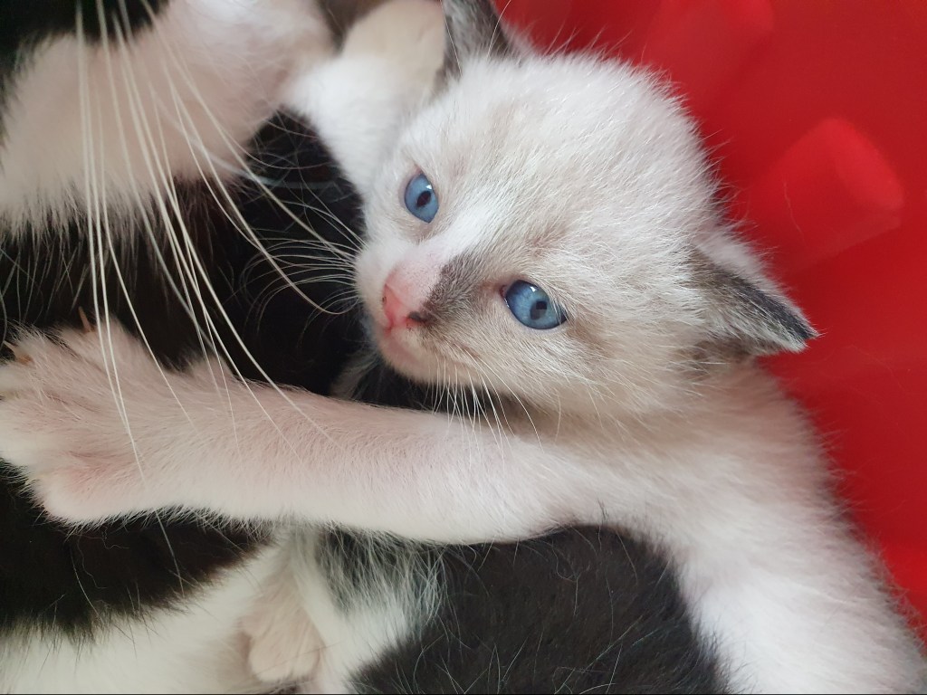 Este gatito es uno de las bebes de Betty, quién fue encontrada pariendo en mitad de la calle, le estaban atropellando los bebes y estaba muy nerviosa por lo que los vecinos le metieron los bebes que quedaban en una caja y ella enseguida se metió con ellos, desgraciadamente a la casa de acogida solo llegaron vivos 4 de los bebes.