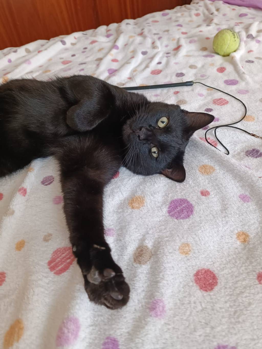 Este gatete ha aparecido en una colonia y su alimentador ha decidido hacerle un hueco en su hogar hasta que encuentre familia. Nos cuenta que es un gato espectacular, buenísimo y muy cariñoso, no para de pedir mimos y cariño.