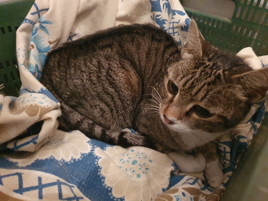 Esta gata fue rescatada a punto de parir en una colonia, donde la llamaban Nati, desgraciadamente todo se complicó y hubo que intervenirla de urgencia. Ahora se recupera en una casa de acogida, mientras su único bebe superviviente se cría a biberón en otra familia de acogida.