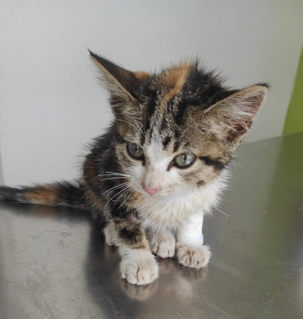 Esta peque ha sido abandonada en la puerta de una clínica veterinaria con la pata rota, en el primer test ha resultado positiva a leucemia. Tras la valoración del traumatólogo se ha decidido intentar que osifique solo el hueso, por lo que la pequeña tiene que guardar reposo.