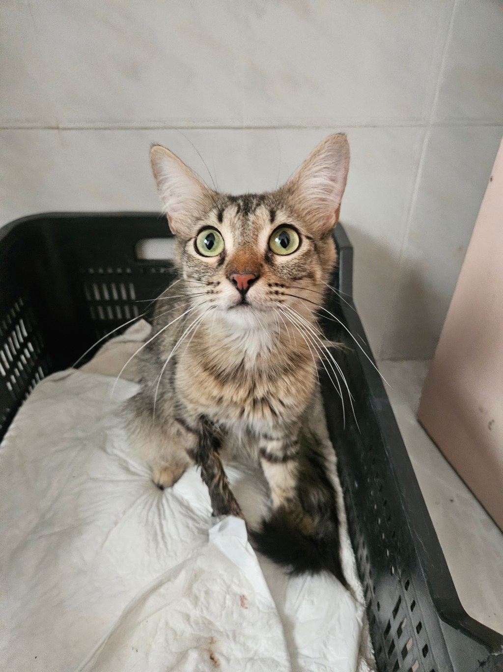 Esta preciosa gata fue recogida junto a sus cuatro cachorros al lado de un contenedor en Ciudad Real, tanto ella como sus bebes son muy cariñosos por lo que es claramente un abandono.