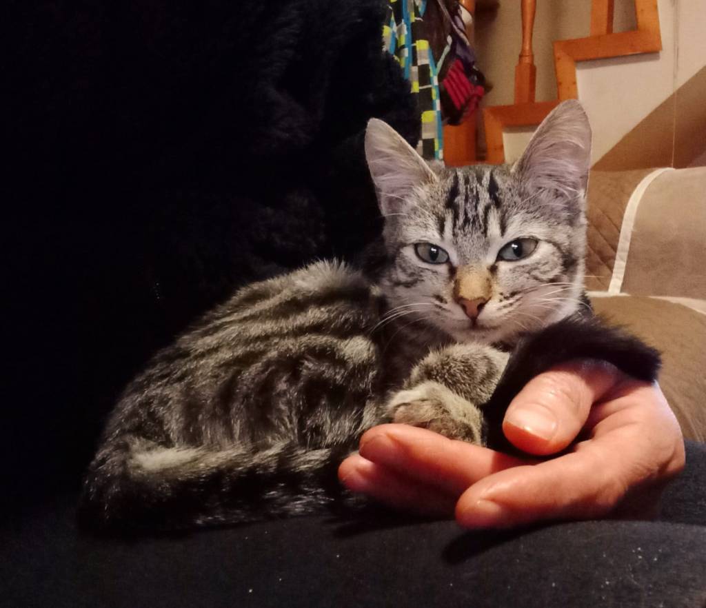 Este peque ha sido rescatado en muy mal estado en Miguelturra por las compañeras de AMA, es muy buena y cariñosa..