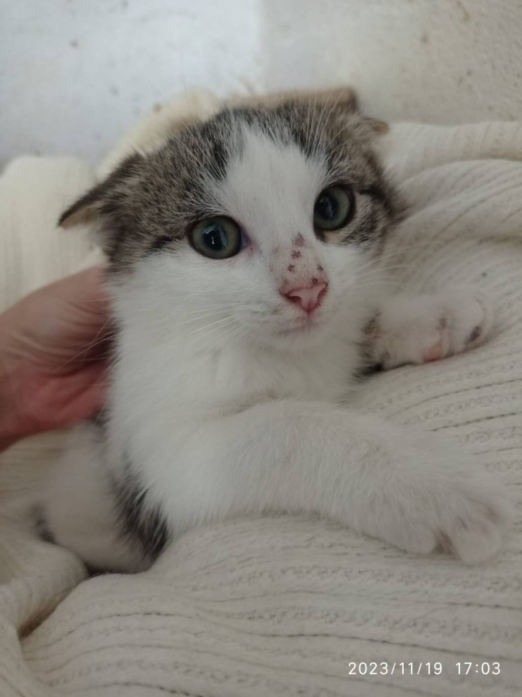 Este gatito ha sido recogido junto a sus hermanos y su madre al encontrarse en los patios de una urbanización . Su mama ya ha sido esterilizada y devuelta a la zona.