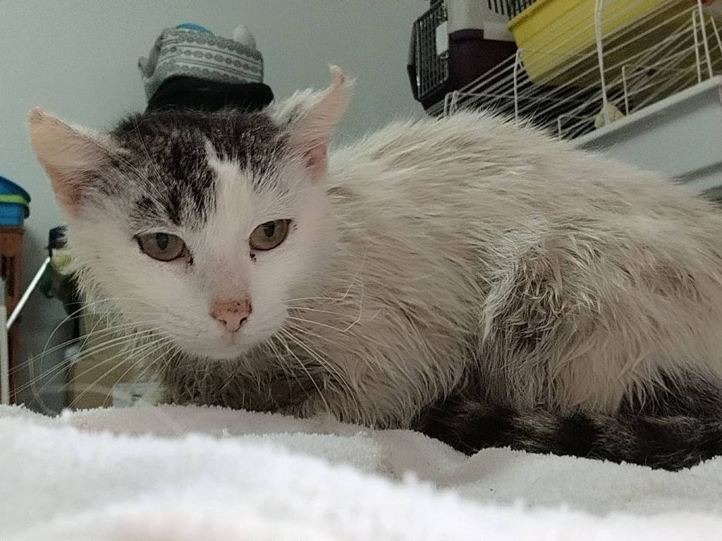 Esta gata ha sido recogida en pésimas condiciones en Miguelturra, aun está en recuperación, pero por desgracia ha dado positivo a leucemia, por lo que sus oportunidades de una familia se han visto muy reducidas.