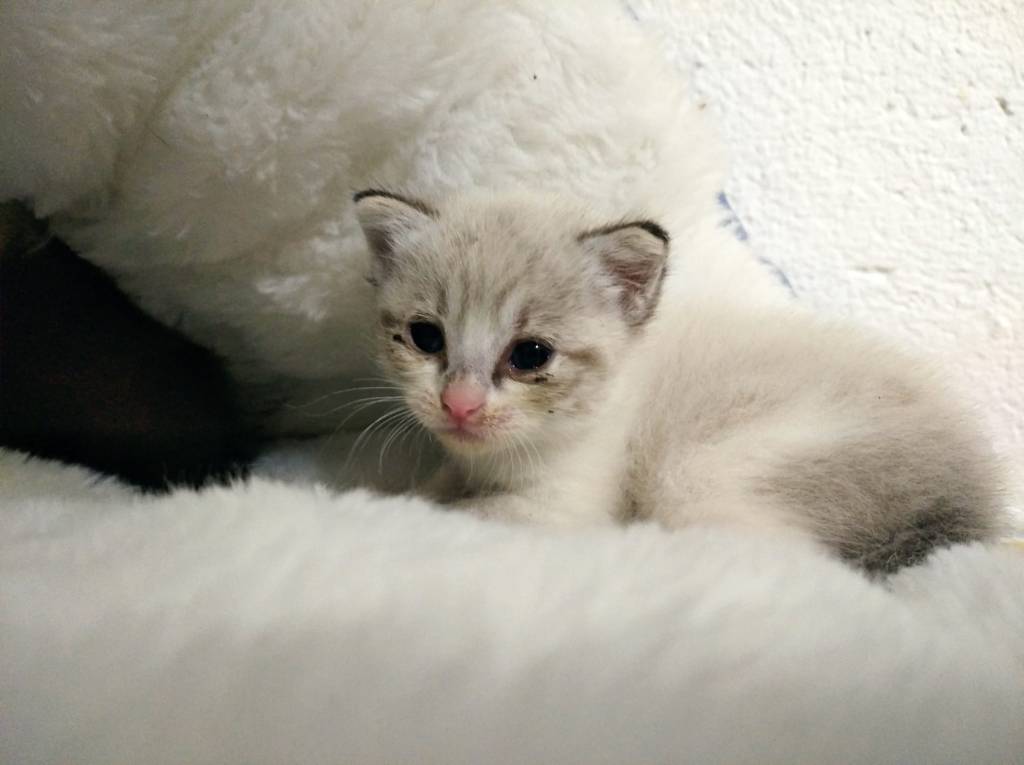 Esta pequeña ha sido dejada en una caja junto a otra gatita de otra camada en la puerta del refugio.