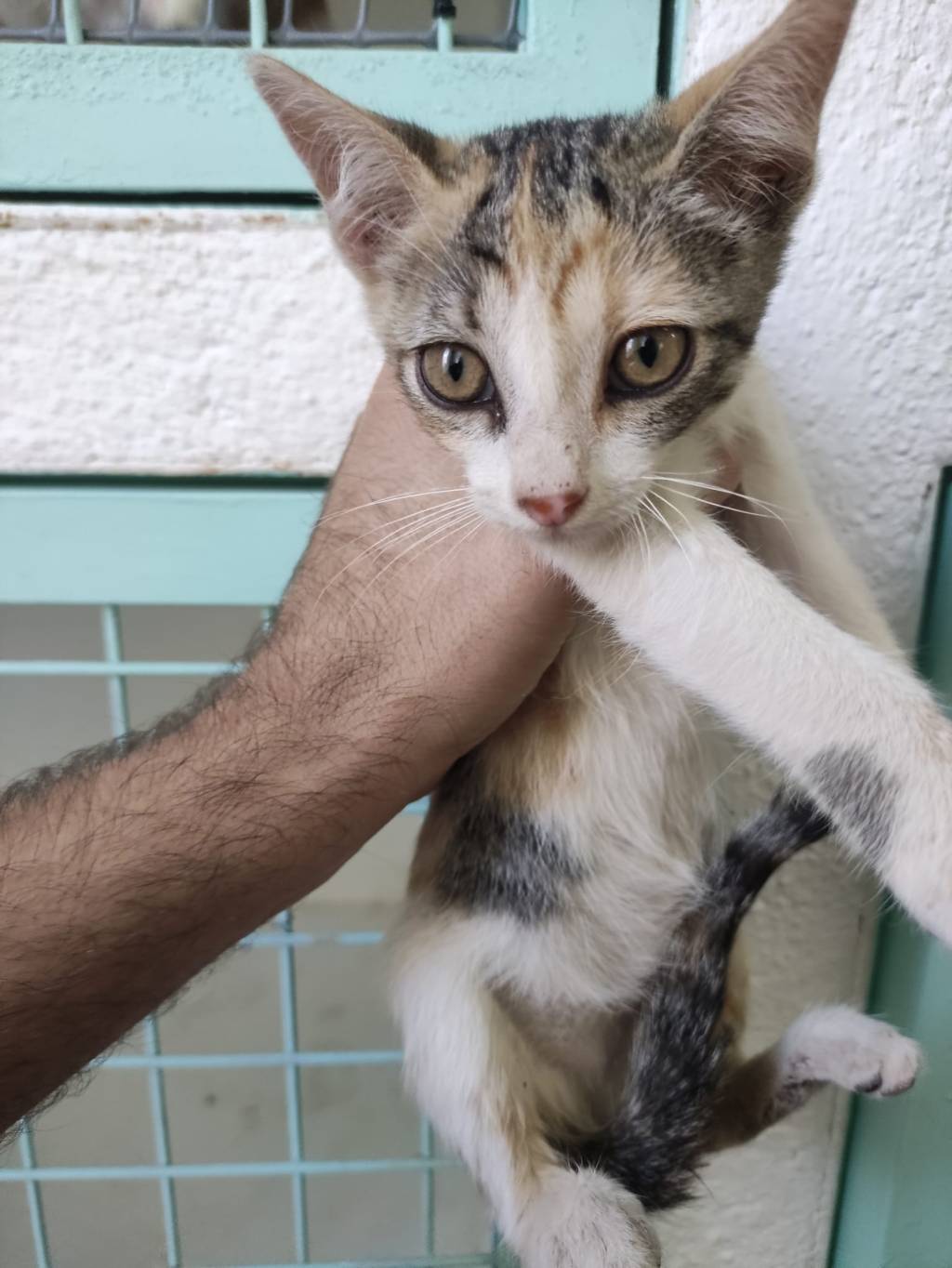 Esta gatita y sus hermanas fueron a dejarlas al refugio en una caja con su madre, cuando se les explicó que no teníamos ni una jaula libre para tenerlos y que solo podíamos hacernos cargo si los acogían se los llevaron de vuelta con la promesa de que iban a hablar con otras asociaciones y plantearse la acogida.
