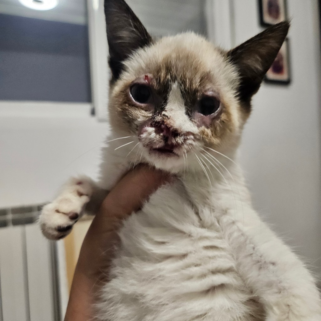 Esta gatita ha sido encontrada con un gran golpe en la cabeza en una colonia controlada de Miguelturra, alguien ha debido de tirarla allí.