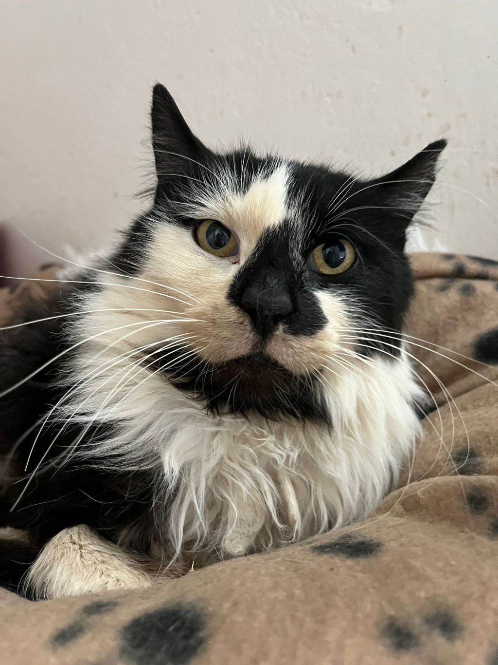 Este es uno de los gatos recogidos del cementerio de Ciudad Real, como la mayoría de ellos, es positivo a inmunodeficiencia, lo que le hace tener su sistema inmune deprimido haciendo que enferme con más facilidad. Actualmente se encuentra en tratamiento por múltiples problemas de salud. Es un gato muy bueno y cariñoso.