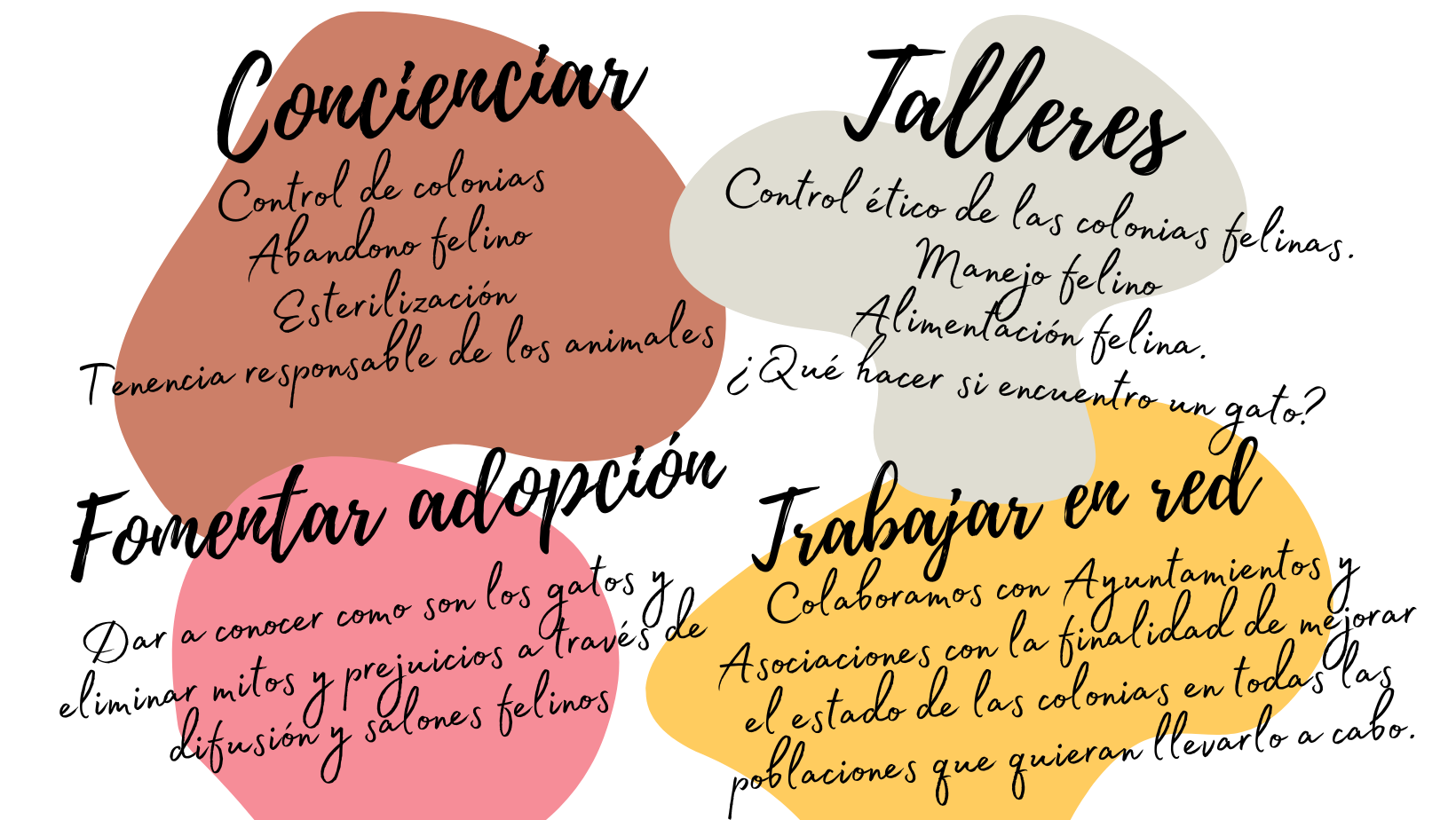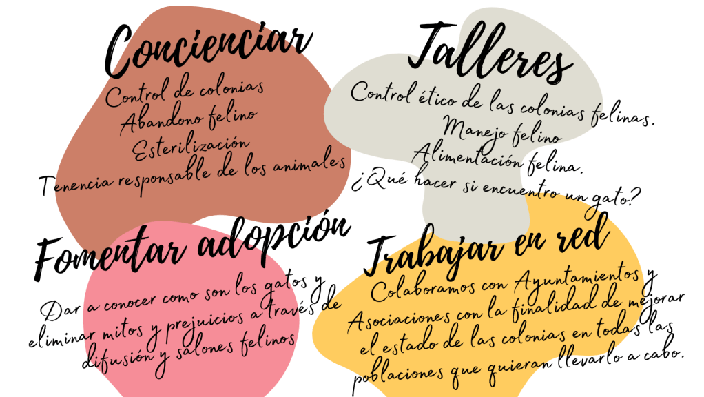 A través de pequeños eventos y charlas en colaboración con otras asociaciones y colectivos pretendemos dar a conocer el mundo felino: sus necesidades, alimentación, manejo, cuidado de colonias, etc.